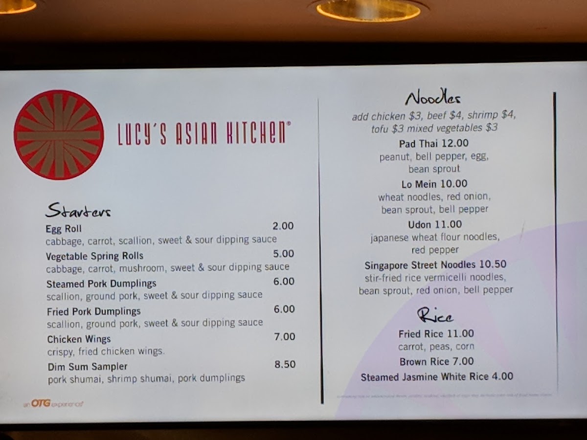 The menu at Lucy's Asian Kitchen offers a selection of Pan-Asian dishes featuring a variety of appetizers, soups, entrees, and light bites. It is structured to provide options suitable for quick meals or casual dining, accommodating travelers and visitors at John F. Kennedy International Airport, Terminal 5.